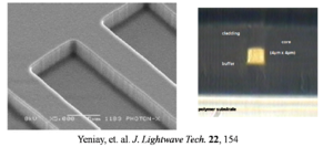 The company Photon X has commercialized the polymer waveguide process. The SEM (5micron line shown) shows very smooth sidewalls from a high quality etching process. Walls can only have roughness of 40-50 nm before there is significant optical loss. The polymer waveguide shows excellent light transmission through a 4 mum x 4 mum waveguide core that has been designed to couple very well with an optical fiber.