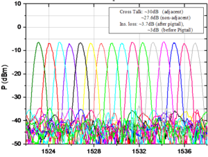 An array waveguide gradiant is used to separate out wavelengths into separate ports. To characterize the device you shine a variety of wavelengths through the device simulating various information carriers and then measure the output from each port. The fluorinated polymer device was able to achieve these results: