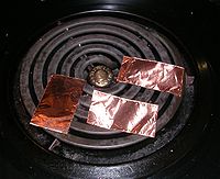 [[Image:Burnerbefore.jpg|left|thumb|200px|Copper before heating ]][[Image:Burnerhot.jpg|center|thumb|200px|copper coated with cupric oxide ]][[Image:Oxidized.jpg|thumb|200px|scraped copper revealing cuprous oxide underneath ]] | [[Image:Burnerbefore.jpg|left|thumb|200px|Copper before heating ]][[Image:Burnerhot.jpg|center|thumb|200px|copper coated with cupric oxide ]][[Image:Oxidized.jpg|right|thumb|200px|scraped copper revealing cuprous oxide underneath ]] | ||