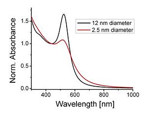 [[Image:]] | [[Image:UV-vis_goldnano.jpg|thumb|300px|'''Figure 3.''' UV-Vis absorption spectra acquired for toluene solutions of oleylamine-coated gold nanoparticles with different diameters. The spectra were normalized at 450 nm.]] | ||