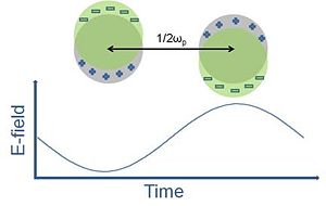 '''Figure 2.''' Schematic of surface plasmon oscillations induced by an oscillating electric field in a metal sphere. The displacement of the conduction electrons (green color) relative to the nuclei (gray color) is shown. The frequency of the surface plasmon resonance is denoted | [[Image:Plasmon oscillation.jpg|thumb|300px|'''Figure 2.''' Schematic of surface plasmon oscillations induced by an oscillating electric field in a metal sphere. The displacement of the conduction electrons (green color) relative to the nuclei (gray color) is shown. The frequency of the surface plasmon resonance is denoted omega<sub>p</sub>. Based on ref. <sup>19</sup>.]] | ||