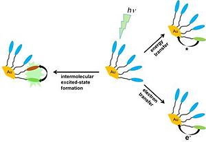 [[Image: | [[Image:Goldnano_excimer.jpg |thumb|300px|'''Figure 6.''' Representation of the reaction studied by Werts et al.Based on ref. 64.]] | ||