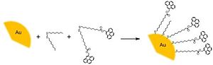 The starting gold nanoparticles were stabilized with tetraoctylammonium bromide (TOAB) which is not shown in the scheme. Such nanoparticles are referred to as “naked nanoparticles” as TOAB is readily displaced by thiol ligands.