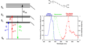 Xu and Webb measured the cross section for laser dyes a goupert mayer. One dye had cross section of 300 goupert meyer (two-photon absorptivity, δ, is expressed in Goppert-Mayer units (GM), with 1 GM=1×10-50 cm4 s molecules−1 photon−1.). The process of two photon absorption was predicted by a German physicist Maria Goeppert Mayer in 1929. TPA was not actually observed until the early 60s when lasers were developed that had sufficient intensity to cause it. Most molecules have GM < 1. These dye have very high two photon cross sections..