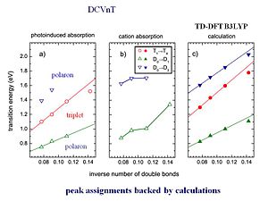 Upon illumination of a material singlet excitons, triplet excitons, as well as charges and can be formed. The absorptions of the species that have been produced through illumination can be followed spectroscopically. This is referred to as looking at the photon induced absorption. This process starts with the illumination upon the system. Then the results are compared based on how absorption has been changed due to the system being put into an excited or ionized state. Calculations have been able to provide a very fine description of the types of species found in the photo-induced absorption spectra.