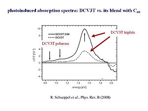 Rico Schüppel [3]and his group in Catalunya have look at the photoinduced absorption in those oligomers. First, he looked at the film of the oligothiophene oligomer alone. Based on what we have learned before, films of the pure oligomers should generate very few charges. In oligothiphenes small intersystem crossing will create a few triplets. Therefore, in the a homogenous film of the three thiophene ring oligomer (oligothiophene), very few charges, polarons, and a few triplets are generated. Something surprising happens when they make a blend of the oligothiophene with C60. You would expect the C60 to grab the electrons from the photoexcited oligothiophene, and thus, see many more charges. In other words, referring to the graph on the slide, you would expect to have a very large increase in the segment corresponding to the formation of polarons and hardly any triplets. However, what they find is that there is indeed a few more charges that are generated but actually, you get many, many more triplets.