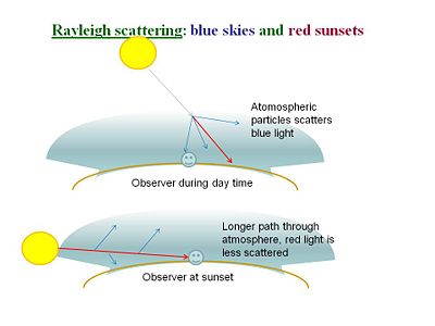 Since Rayleigh scattering is proportional to <math>\frac{1\}{lambda_4}\,\!</math> scattering is larger for blue light than for red light. For a given angle of scattering the blue light will be scatter 16x as much as the red. This is the reason the sky is blue.