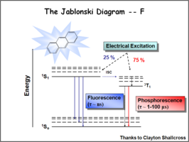 Finally, to form the triplet state you can have three types of triplets. Thus it is three times as likely to form a triplet as it is a singlet which accounts for the 3:1 triplet to singlet ratio in systems of this type. It is debated whether or not these ratios apply in the condensed phases. They apply in solutions and early indications are that it also applies in the condensed state. The consequence of this is that if you are going to optimize a light source you must harvest as much of energy of the triplet state as possible.