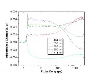 Chemical species are driven into the excited state by a of monochromatic pump laser and the spectral qualities are measured with a broad spectrum probe laser. Both the pump and probe are extremely short duration, about 100 femtoseconds. The delay between the pump and the probe is controlled by changing the length of the optical path with moveable mirror.