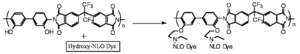 Another way to improve the stability of the system is by attaching the material to the host. Polyimid is a high temperature polymer. Alex Jen incorporated functional groups and then added a dye with a hydroxyl group. He attached the dye after the material was polymerized because the conditions for forming the polymer are quite harsh.