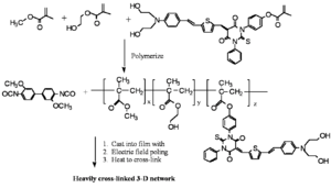 Sufficiently different reactive functionalities permit a two-step process to selectively polymerize the precursor polymer first, and then perform the hardening step during the curing/poling process. The OH groups off of the dye and polymer mixed with an isocyanate which reacts with an alcohol to form a bond and make a carbonate. They mix it, cast it into a film, heat it, pole it and allow the isocyanate groups to lock the chromophore into its desired orientation.