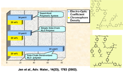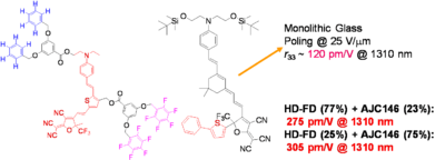 Using a monolithic glass poling Alex Jen at UW has Achieved a Milestone: r33 of 500-600 pm/M. Work is in progress to improve thermal stability and mechanical properties of highly efficient EO dendrimers and demonstrate ultra-high EO performance in device stage.