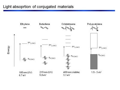 From the point of view of the π level butadiene corresponds to the interaction between two ethylene sub-units. The π homo level of one ethylene subunit interacts with the π homo level of the other subunit. There can be a positive combination and a negative combination, one leads to a level that is more stable one that is less stable. The same thing happens for the π* levels. The π * LUMO has come down while the π HOMO has increased. As a result the energy difference between HOMO and LUMO (the first optical transition ) has decreased to 5.4 eV.