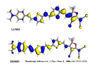 The generalized chromophore is a π-conjugated bridge (symmetric) which has been substituted with an electron donor and an electron acceptor. The substitutes induce a ground-state electron density asymmetry. When such a "push-pull" system is placed in an electric field increases it's polarization (in order to reduce its energy) and therefore changes its molecular first hyperpolarizability.