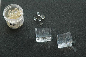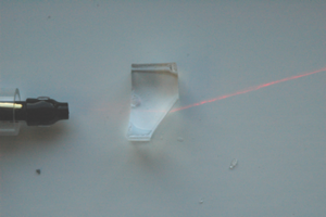 Light can be refracted. One day before the demonstration place several of the optic grow cubes into water in a plastic bag. Each cube will expand into a 3 cm, optically clear cube. Use the single edge razor to cut the cube into various shapes used in optics. Alternatively cast a sheet of clear gelatin using three times as much gelatin as is called for on the recipe. Use the laser pointer to show how lenses and prisms work. Try making a convex lens, a concave lens, an equilateral prism, a fiber optic tube, a periscope with right angle prisms.