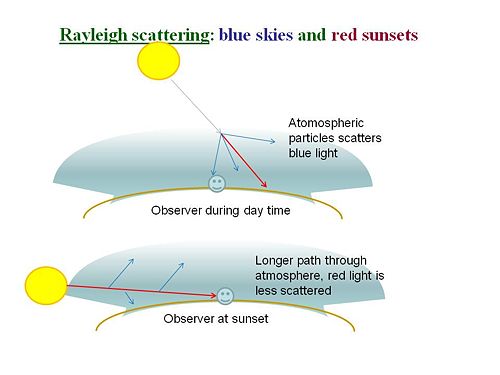 Since Rayleigh scattering is proportional to <math>\frac{1}{\lambda^4}\,\!</math> scattering is larger for blue light than for red light. For a given angle of scattering the blue light will be scatter 16x as much as the red. This is the reason the sky is blue.
