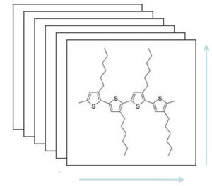 Because of the macrostructure of polymers, conduction is anisotropic. Polythiophene when applied as a film tends to stand on edge so it forms sheets with π-π stacking and is therefore anisotropic. Conduction in polythiphene is greatest in the π-π stacking direction, followed by a slower conduction in the direction aligned with polymer chain, and finally the lowest charge mobility is between the chains where there is a large distance to hop. Therefore to maximize charge mobility we must maximize π-π stacking. People are trying to make longer chains to increase stacking, however increased stacking means the solvent can't penetrate and these are less soluble and have reduced solution processibility. The addition of alkyl chains increases solubility however this decreases the π-π stacking. The challenge is to strike the right balance between performance and ease of solution processing.