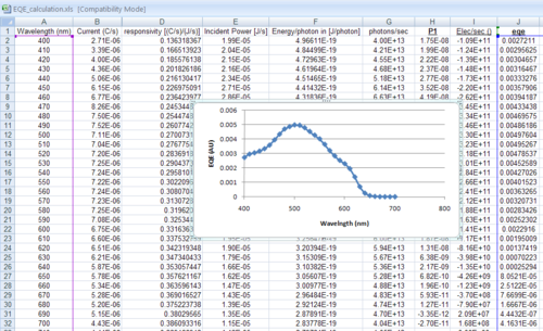 This produces an series of wavelength / current data pairs which can be brought into Excel to calculated EQE graph the results.