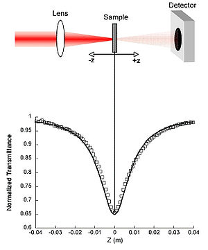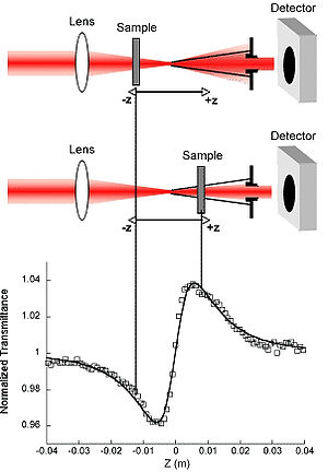 The closed aperture z-scan is based on the self-focusing effect. The index of refraction of a third order material changes as the intensity of the beam changes. As a sample through a focused beam the intensity of incident light increases to a point where the sample changes its index of refraction and alters the focus of the light. The width of the beam determines how much of the light passes through an aperture which can be measured with a simple detector.