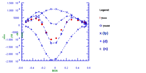 The figure at right displays how the second hyperpolarizability γ varies as a function of bond-order alternation (BOA) in a one-dimensional polymethine structure. The tensor component included in the plot is xxxx, where x represents the long axis of the molecule (the other components are negligible for these systems). As introduced elsewhere, BOA is the average value of the difference between the length of adjacent CC bonds in the chain [[2]]. The left side of the plot corresponds to the polyene limit (large and negative BOA), the cyanine-like limit corresponds to BOA = 0, and the zwitterionic limit to large and positive BOA. γxxxx (red dots) is calculated using perturbation theory. It can be noted that γ starts positive in the polyene limit, goes through a maximum, then through zero before assuming a large negative value at the cyanine-like limit; the behavior is symmetrical on the BOA > 0 side of the plot .