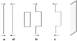 The figure at right illustrates the operation of a phase conjugate mirror. A planar wave (a) passes through a distorting material (rectangle), which introduces an aberration in the wavefront. Then the light interacts with a phase conjugate mirror (gray area) creating the phase conjugate wavefront (c). Then the phase conjugate wave passes through the distorting material on the reverse path, canceling the original aberration thus producing an undistorted wavefront (d). Aberrations in the wavefront can be caused by the medium not having a uniform refractive index, so that portions of the light will travel faster than others, and leading to a deformation in the original wavefront. When the wavefront hits the phase conjugate mirror, the propagation direction of the beam reversed, but the shape of the wavefront is not changed: the part of the beam that comes into the mirror first ends up leaving last and viceversa. When the reversed beam travels back and encounters the original material, portions of the beam are going to be slowed, other sped up, as previously, but now the process acts on a distorted wavefront. The result is that distortion produced by the second pass exactly cancels that of the first pass, thus the aberration is removed and the original wavefront is obtained.