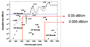 One strategy to improve the absorption is to substitute hydrogen for a heavier version of hydrogen in order to decrease the vibrational energy. The graph shows that by replacing hydrogen with deuterium (upper graph), which is double the mass, does improve the performance at 1310 but this works against you 1350nm. By replacing H with a halogen you can get losses down to .005 dB/cm