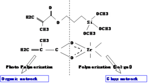 On the (right) side is an inorganic or glass network built around silicon bonded to methoxy groups. In the sol-gel reaction these become OH groups, and Si-O bonds form essentially making glass. The zirconium propoxide is used to adjust the refractive index. By changing the fraction of the organic and inorganic components the refractive index can be adjusted