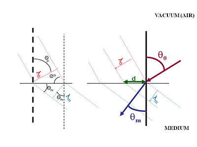 The normal surface is shown as a vertical line. The incident beam hits with an angle <math>\Theta_0\,\!</math>, and the refracted beam has an angle of <math>\Theta_m\,\!</math>. The difference in these two angles is what makes light appear to bend. d has to be the same for the incident beam as the refracted beam. Using geometries of rectangles and triangles the <math>\lambda_0\,\!</math> depends on the sine of <math>\Theta_0\,\!</math>, and <math>\lambda_m\,\!</math> depends on the sine of <math>\Theta_m\,\!</math>.