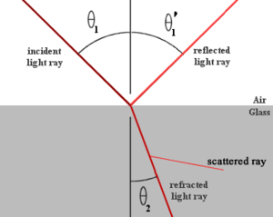 When light penetrates a material the frequency n is not affected but the wavelength is. Light will be reflected symmetrically. In a perfectly smooth specular (from the latin speculum- meaning mirror) surface the angle of incidence is equal to the angle of reflection. If you have rough surface light will be reflect in all directions causing diffuse reflection.