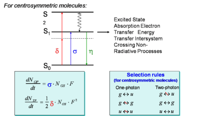 This shows that the probability of two-photon absorption depends on the square of the photon flux (or, equivalently, to the square of the light intensity). The selection rules for the two-photon absorption process are different from those for one-photon absorption (in analogy to the situation for infrared and Raman spectroscopies). In particular, a two-photon absorption transition is allowed only between two states that have the same parity. Thus, in molecules with an inversion center, transitions are two-photon allowed from a gerade (g) state to another gerade state or from an underage (u) to another ungerade state, but not between g and u states. In the case of one-photon absorption, instead, transitions are allowed between an initial state and final state with opposite parity (from g to u, or vice versa). This implies that, in centrosymmetric molecules, if the transition from the ground state to a given excited state is one-photon allowed it is not two-photon allowed and, vice versa, if it is two-photon allowed it is not one-photon allowed. For molecules without inversion center, certain transitions can be both one-photon and two-photon allowed. In the scheme above, the blue arrow represents the excitation of a centrosymmetric molecule to the lowest excited state, S1, by the absorption of one photon (with one-photon absorption cross section σ); this transition is not two-photon allowed. The molecule can be excited by two-photon absorption (red arrows) into a higher-lying state, S2 (with two-photon absorption cross section δ).