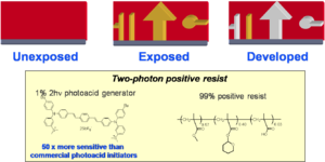 Top: In a positive tone resist the exposed areas (yellow) are removed (grey) during development. Bottom: example of a positive tone resist containing a two-photon photoacid generator.