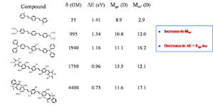 The observation above suggests certain design strategies for increasing the dipole or quandrupole moment: if you want to make the dipole (or quadrapole) moment larger you can increase the distance over which charge is separated and you can increase the charge that is separated by that distance, or do both. The first would correspond to increasing the length of the molecule, the second to introducing functional groups that can facilitate the charge transfer. This is the role that the dibutylamino groups play in BDAS with respect to stilbene. This interpretation is supported by results of quantum chemical calculations performed on these molecules (in the calculations, dimethyl- instead of dibutyl-amino groups were considered). The transition dipole moment between the ground and first excited state is 7.2 D for stilbene and 8.9 D for BDAS. The biggest change, though, is observed for <math>M_{ee^{\prime}}\,\!</math>, as the transition dipole goes from 3.1 D in stilbene to 7.4 D for BDAS.