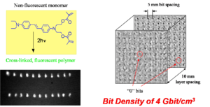 This two-photon induced polymerization technique can be used in optical data storage applications. For example the compound shown at right is non-fluorescent, but it becomes fluorescent when the pendant acrylate groups are incorporated in an acrylate polymer. When this compound is mixed with other acrylate monomers and exposed to laser light at an appropriate wavelength and intensity, TPA-induced polymerization takes place and the resulting polymer is fluorescent. The resin in the unexposed areas remains non-fluorescent. The image at the bottom left shows two rows of fluorescent bits, obtained by two-photon induced polymerization, on the dark background of the unexposed resin. After laser exposure, the polymer also has higher density, due to cross-linking, than the unexposed portions of the resin. If the density goes up and the polarizability of the material stays the same, the susceptibility goes up and the refractive index goes up. Thus, it is also possible to "read" the bits based on the contrast in refractive index. Peter Rentzepis at the UC Urvine is using this method to create a 3D optical memory. Because of the three-dimensional confinement of the excitation volume that is characteristic of the TPA process, it is possible to write and read sets of bits in multiple layers within the material, each layer independently from the one above and the one below. The image on the right side shows two such layers: the "1" bits (dark spots) can easily be seen in each of the layers, as well as one "0" bit per layer. The ability to write on hundreds of different planes increases the amount of information that can be stored in a given volume of material (gigabits or terabits of data per cm3 are achievable).