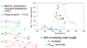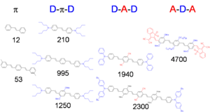 The diagram reports the TPA cross section (numbers under the molecular structures, in GM units) for a series of molecules with phenylene-vinylene conjugated backbones, to show the effect of donors (shown in blue) and acceptors (shown in red), as well as longer molecular chain lengths. The trend observed for δ in these compounds is consistent with the expectations based on the three-level model. The combination of these design strategies allows to achieve cross section on the order of thousands of GM. The trend in cross section when the molecular structure is changed are further illustrated in the following two sub-sections.