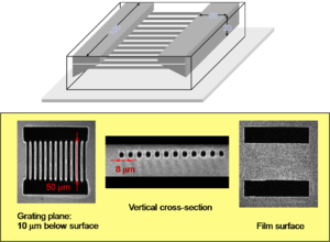 Top: Schematic of microchannel structure. Bottom: Two-photon induced fluorescence images of the structure, fabricated in a positive tone resist, at various depths in the material (the central image is a cross section halfway along the channel lengths).