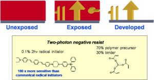 This is an example of a TPA dye that creates a radical initiator after excitation. The radicals generated can then initiate polymerization in a resist (for example an acrylate). The polymer is less soluble than the starting resin and the nonpolymerized material can be removed by immersion in the solvent. Only the exposed areas that are attached to the substrate (or linked to each other) remain after development in the solvent. This is known as a negative tone resist.