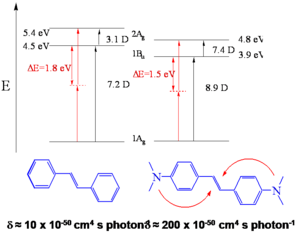 For this compound, the maximum TPA cross section (at 600 nm), δ was measured to be 210 x 10-50 cm4 s/photon, while for stilbene (i.e. if the two donor groups are removed) δ = 12 x 10-50 cm4 s/photon. Thus, the TPA cross section of BDAS is about 20 times that for the molecule without the electron donor groups. δ for BDAS is very large and it is useful to understand why the donors have this effect.