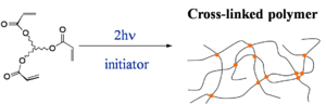 Two-photon absorption can be used to initiate photo-polymerization on a precise microscopic scale in 3D. A beam can be focused at a desired position in a polymer precursor, an initiator in the precursor is excited by two-photon absorption, photoactivating the polymerization or cross-linking in the material. This process is confined to the vicinity of the excitation volume. When the laser beam is moved to a different position, the polymerization or cross-linking is initiated in the new location. Then the non-crosslinked portions (those that have not been exposed to the laser beam) can be washed away by a solvent. This process can be used for microfabrication, that is the fabrication of a polymeric structure at the microscale with good control of the feature sizes in three dimensions, by scanning the laser beam in a prescribed pattern. This process has been used to fabricate structures in various types of resins and high degree of complexity. Selected example can be found in the following publications: