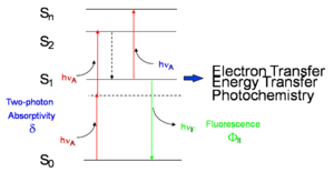Once the molecule is in state S2, it quickly relaxes by internal conversion to the lowest excited state (S1 in the figure). From this state, the system can return to the ground state S0 by emission of fluorescence or by nonradiative decay. Alternatively, an additional photon can be absorbed (bringing the molecule to a higher-lying excited state, Sn), or electron or energy transfer to another molecule can take place. Typically, once the molecule is in state S1, the same set of processes will take place whether the molecule was initially excited into S2 by two-photon absorption or directly into S1 by one-photon absorption. For most known materials the two-photon absorption cross section, δ, is small and it is necessary to use intense laser beams in order to observe the effects of two-photon absorption.
