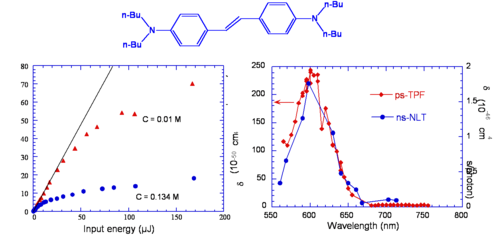 It was mentioned above that nonlinear transmission was observed in BDAS. This material behaves as a good optical limiter for nanosecond pulses (see plot on the left side of the figure, for two different concentrations). This is due to the fact that the TPA cross section of this molecule is large, as seen above, and that this molecule also has a large excited state absorption cross section; when the molecule is excited with nanosecond pulses at a wavelength between 550 and 650 nm, a cascade of TPA and ESA processes takes place, resulting in large attenuation of the incident beam (optical limiting). The plot on the right side of the figure displays the TPA cross section of the compound obtained from a two-photon induced fluorescence measurement (ps-TPF, shown in red) and the nonlinear transmission spectrum (ns-NLT, shown in blue), that is the values of "effective" TPA cross section obtained from a NLT experiment with ns pulses: the two curves are similar in shape, but the scales of cross sections are different. The ns-NLT scale has units of 10-46 cm4 s/photon and the ps-TPF spectrum is on the scale of 10-48 cm4 s/photon, a factor of 100 difference. This is another example of the fact that NLT measurement performed with long pulse durations yield only the "effective" TPA cross section, which involves two-photon absorption followed by excited state absorption, as opposed to the "intrinsic" TPA cross section, which can be obtained from two-photon induced fluorescence measurements or other techniques that allow to exclude the effect of ESA (such as z-scan measurements with fs pulses at moderate peak intensities of the laser beam).