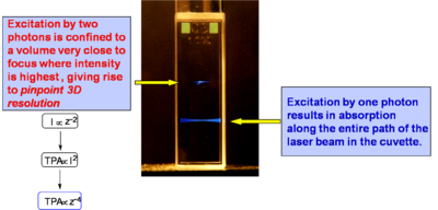If a light beam is focused into sample at a wavelength suitable for one-photon absorption, molecules are excited throughout the beam path in the sample, as evidenced by the fluorescence emission in the bottom part of the cuvette at right. If the beam is tuned at a wavelength at which the material exhibits two-photon absorption, only the molecules located very close to the focus of the laser beam are excited (top beam in the photograph). This is related to the fact that the excitation rate depends on the square of the light intensity, as discussed above, and that in a focussed beam the light intensity is maximum at the focal plane and decreases approximately with the square of the distance from the focal plane, z, along the propagation direction (because the area of the beam increases moving away from the focus). Overall, the excitation rate for TPA and the intensity of the two-photon induced fluorescence decrease as the forth power of the distance from the focal plane. Consequently, in the solution in the figure the two-photon induced fluorescence is strongest at the beam focus and its intensity drops off very quickly on either side of the focal plane, resulting in what looks like emission from a "single point" (or small volume) in the solution. At the diffraction limit, the TPA excitation is confined to a volume on the order of the cube of the wavelength of the excitation light. Most of the applications of TPA are based on this ability to confine and control the excitation volume in a material with good resolution in three dimensions, as any excited state process that can take place in the material after two-photon excitation (such as fluorescence emission or energy transfer) will be confined to the same small volume.